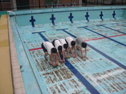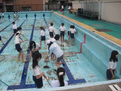 校長先生もいっしょにプール清掃に参加しています。