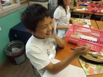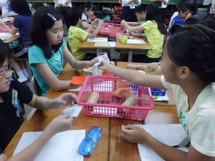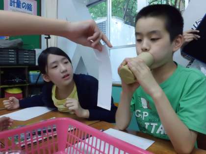 風通しや吸収性、速乾性や肌ざわりなどを調べていきます。どんな素材が夏の服には適しているかな?