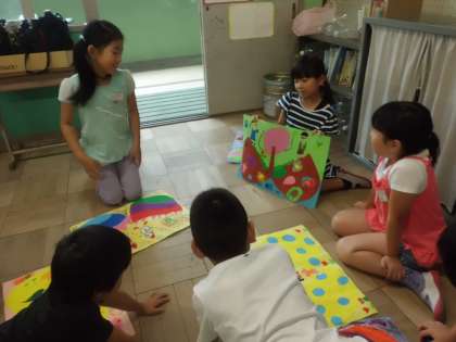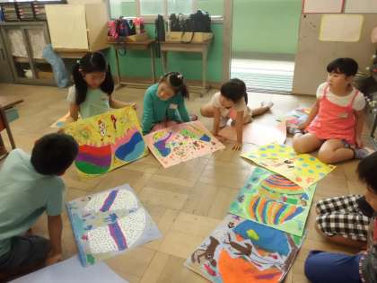 参観日で作っていた「たまご」が完成しました。今日は,鑑賞会です。どんな世界が生まれたか,がんばったところや,くふうしたところなどを友達に発表しました。「その虫は,なんという虫ですか。」「たまごの模様がおもしろいですね。」と質問や感想もたくさん出ていました。
