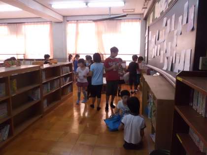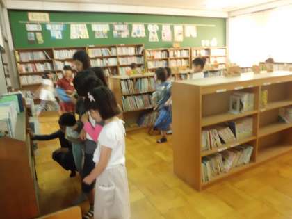 今日は雨だったからか,たくさんの人が図書室に本をかりにきていました。みんな真剣に選んでいます。