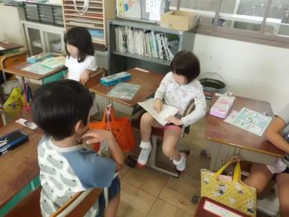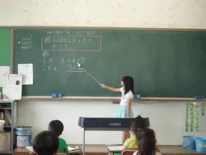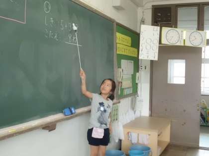 最後には,絵だけを見て「3+2=5」になるお話づくりもしました。
