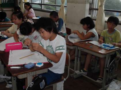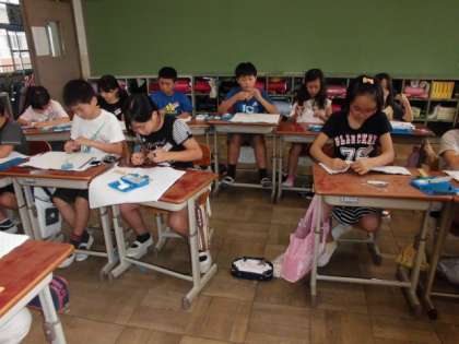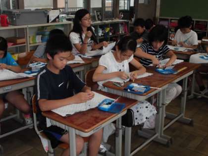 まず,まち針を打ちました。これだけでも,けっこう大変で時間がかかりました。次に,なすかんをつけるためのテープをはさんで固定します。そして,やっと脇縫いにはいりました。みんなとてもがんばりましたが,まだ,玉止めにも苦労している人もいて,今日は,脇縫いの途中で終わってしましました。また来週,続きをがんばりましょう。