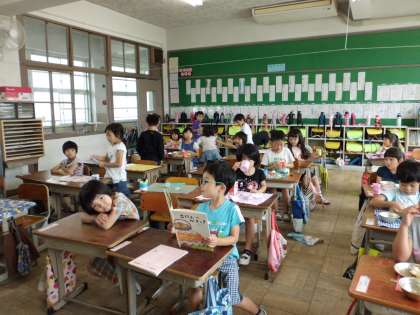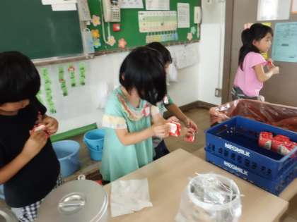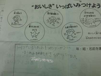 牛乳パックのたたみ方も上手になりました。食べ終わったら,ぶくぶくうがいをしたり,本を読んで静かに過ごしたりします。また,今日の給食の感想を書くことがブームで,食べ終わった子どもがいつも楽しそうに集まって書いています。