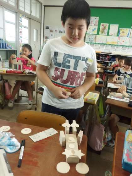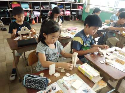 図画工作では,金づちを使って作品を作ります。今日は,木を組み合わせて完成をイメージしました。想像がふくらみますね。