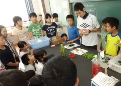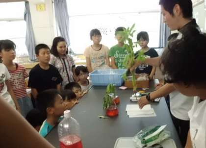 水の通り道がよくわかるように着色したホウセンカ。断面を切って調べるので,しっかり説明を聞きましょう。根も茎も葉も調べるのですね。