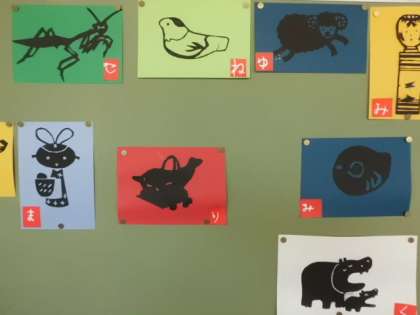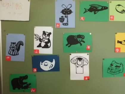 理科室の横に切り絵クラブの作品が掲示されています。じょうずですね。