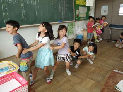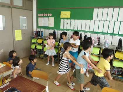 国語「おおきなかぶ」の学習で,音読劇の練習を始めました。10人グループで役割を決め,動きや声の合わせ方を練習しました。「うんとこしょ,どっこいしょ。」と大きな声で頑張っています。