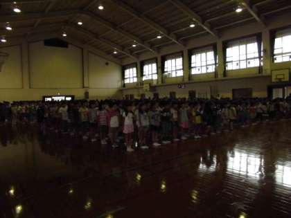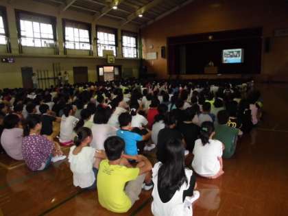 夏休み明けの「朝会」です。校長先生のお話の中で夏休み中の出来事をふり返り,これからの学校生活を考えることができたと思います。
