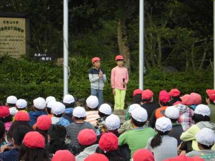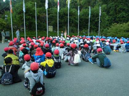 おはようございます。2日目の朝をむかえました。宿泊している5校合同の「朝の集い」です。所員の方から山の家の自然についてのお話を聞いた後,それぞれの学校紹介がありました。