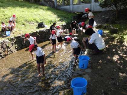魚つかみです。水はとても冷たく足がこおりそうです。