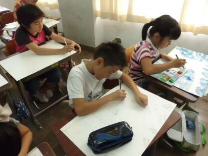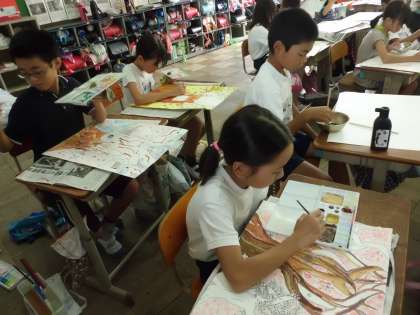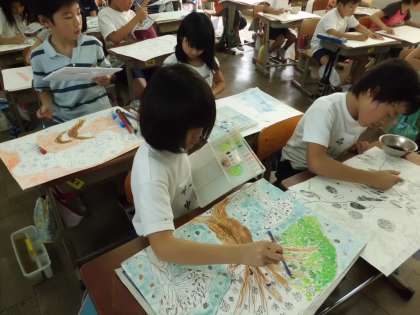 今日は,お話の場面で自分で想像した下絵をかき,彩色しました。丁寧に彩色することをめあてに,森の木々の様子を描きました。