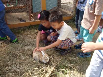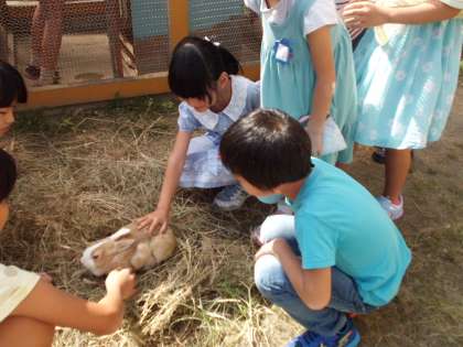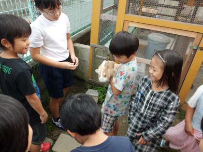 飼育委員さんが1年生のためにふれあい会を企画してくれました。初めて触れるモカとジャックに,どきどきわくわく。「意外と毛がしっかりしてる!」「ふわふわで可愛い!」といろいろな発見をしていました。