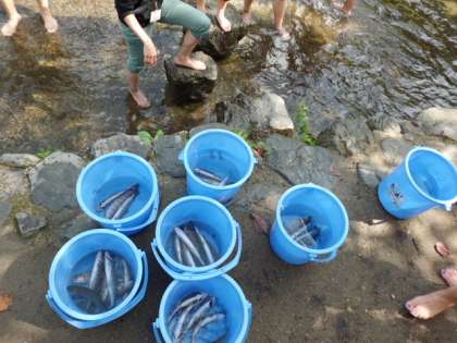 次は野外炊事場に移動します。つかんだ魚はどうなるのかな…。