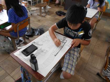 墨汁と割り箸を使って,下書きの線をなぞっていきます。みんな,細かい部分までかきこんだので,とっても素敵な絵に仕上がりそうです。