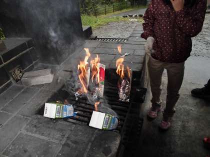 パンにカレーキャベツとウィンナーをはさんでアルミホイルでつつみます。そして,牛乳パックに入れます。