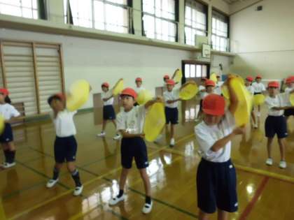 2年生は,花笠音頭を踊ります。笠の使い方が難しくて苦戦している子もいます。