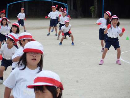 今日は,運動場デビューです。体育館で練習してきたダンスは玉入れの入場のあとにします。広い運動場でしかも初めてカラー軍手を使ってのダンスで,とても張り切っていました!