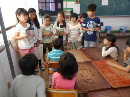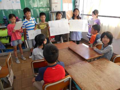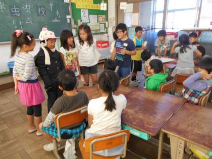 今日は,1年生に,川岡小学校でこれからどのような行事があるのか伝えにいきました。校外学習のことや,持久走大会のことなど,ポスターを使ったり劇をしたりしながら発表しました。スケート教室のことを発表したグループは,実際にスケート教室で着る服装を用意して,着替えていました。1年生のみなさんは,3年生になったらスケート教室にいきますよ。楽しみですね。