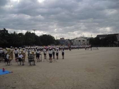今日は初めての運動会の全校練習です。金管バンドの演奏に合わせての入場です。