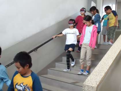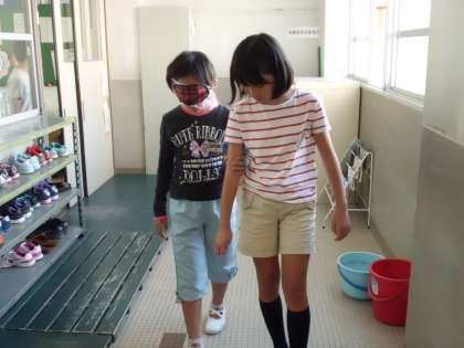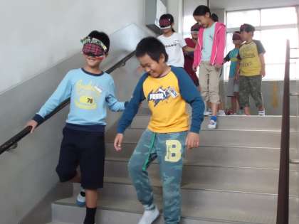今日は,アイマスク体験を通して,目が見えない生活とはどのようなものかを感じ取る学習をしました。学校生活の中で毎日上り下りしている階段でも,ガイド役の友達がいないと怖かったという人が多かったです。