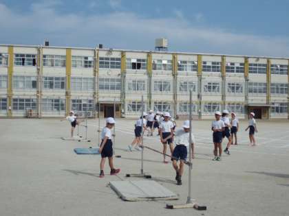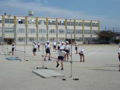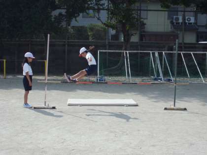 今日から「高とび」の学習がはじまりました。踏み切りの足を決めるため何度も跳んでいました。