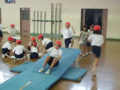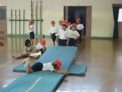 ねらい1からねらい2へ場を変えるのはとても難しいですがみんなで協力して頑張っています。ねらい2の「長イス坂の場」は大人気でみんな前回りをくるくると上手に回っています。