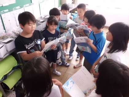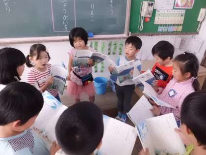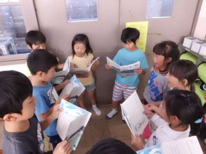 今日は,「くじらぐも」の音読発表会をしました。みんなで役割を決めて練習をしました。身ぶり手ぶりも自分たちで考えていてとても素敵な発表会になりました。「天までとどけ,一,二,三」とみんなで手をつないでジャンプをしているグループもあり,とても可愛いらしかったです。