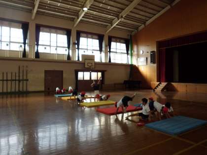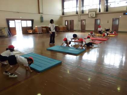 体ならしの「ロバキック」では,足が高く上がっている子どもが出てきています。「カエルの足うち」も初めは足うちができなかった子どももできるようになってきました。みんな楽しそうです。