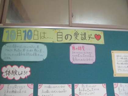 10月10にちは目の愛護デーということもあり、保健室前にも掲示物を作りました。