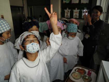 献立を確かめて,思わずVサイン!!の給食当番のみんなです。