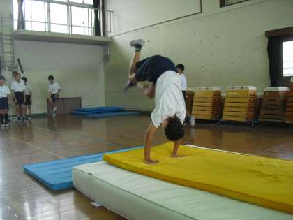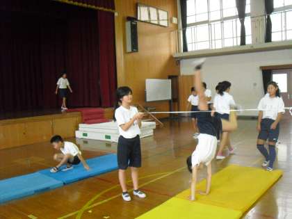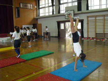 6年生のマット運動は少しがんばればできそうな技に挑戦です。工夫された場を使って、みんながんばっています。