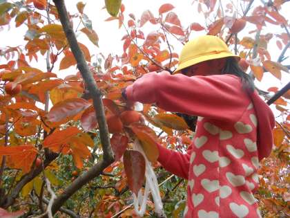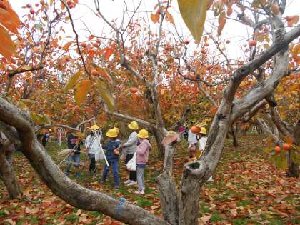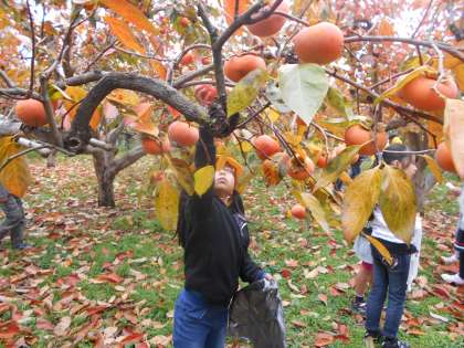 いよいよ,柿を収穫します。大きな柿を2つ選んで,くるくる回してとります。みんなで協力して,さがしている人もいましたよ。