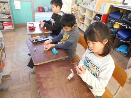 今日は一日自由参観です。理科では,豆電球にあかりをつけようという実験をしました。どうやったらあかりがつくかな?