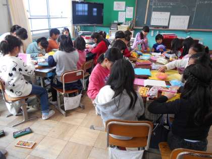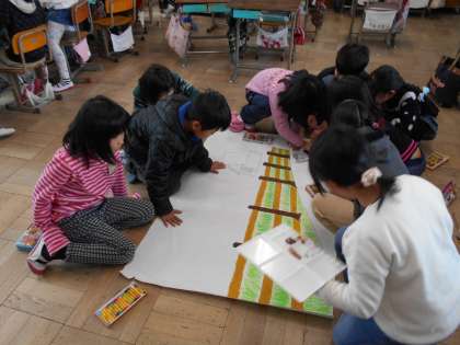学習発表会で使う道具や衣装をつくりました。作り終わったグループから,せりふの練習をしています。とってもすてきな道具や衣装ができあがりました。本番を楽しみにしていてくださいね。
