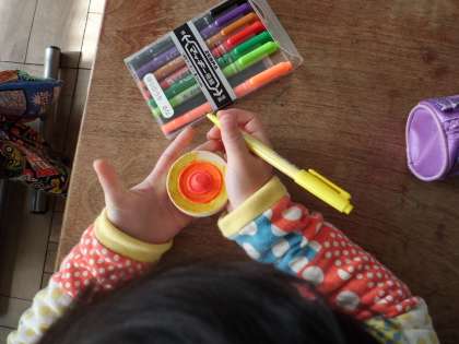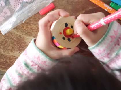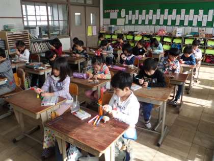 木ごまに模様を描き,自分だけのこまを作りました。28日には地域の方に昔の遊びについてたくさん教えていただきます。上手にまわせるように,これから練習していきます。