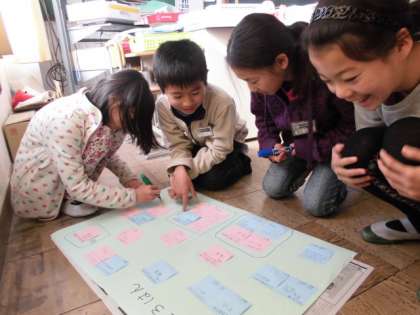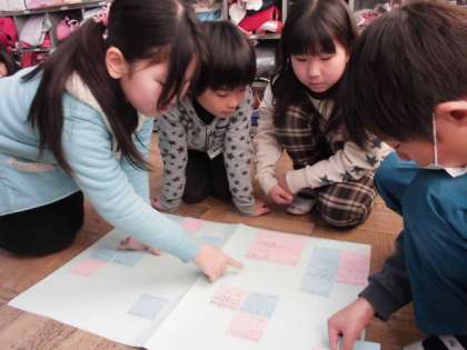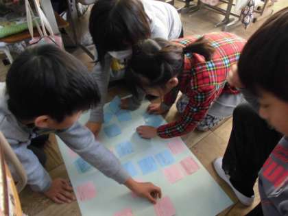 ふせんに書きだしたエコライフの取組を,にているものどうしグループ分けして,「エアコンの温度」や「ごみの分別」などグループ名をつけました。