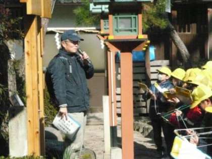 実は,三宮神社の中にあるムクノキを見て方角を確かめているそうです。三宮神社にあるムクノキは,樹齢300年以上だそうです。高さは20mで川岡小学校で例えると,5階建ての高さになるそうです。(川岡小学校は4階までしかありません。相当高いですね。)