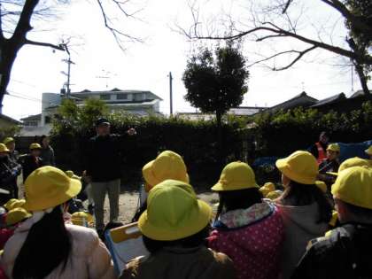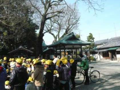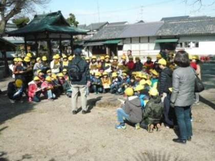 三宮神社には,ムクの木以外にもたくさんの木があります。学校運営協議委員の尾藤様にご説明いただき,子どもたちは熱心に話を聞いていました。