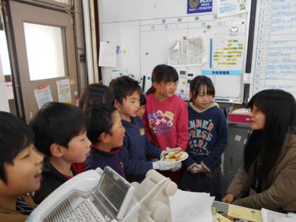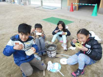 おしょうゆをつけて,おいしくいただきました。たくさん焼いたおもちは,職員室の先生たちにおすそわけをしました。