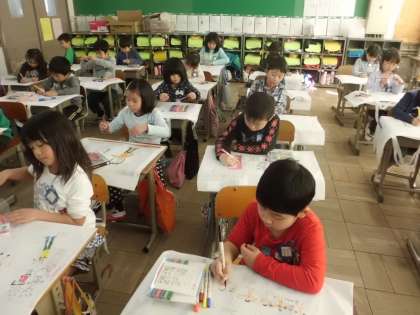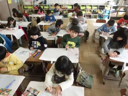 図工の学習で1年間に描いた絵を入れる作品バックに絵を描きました。