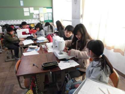 みんなミシンにはとても興味があります。でも,今日は難関「上糸をかける」「下糸を出す」という作業です。悩みながらも楽しく取り組みました。