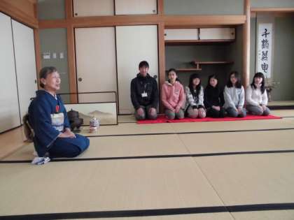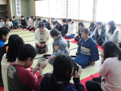 おごそかな雰囲気の中で,日本の伝統である「茶の湯」についてお話を聞いたり作法を教えてもらったりして,お茶を味わいました。女性会から記念品もいただきました。どうもありがとうございました!
