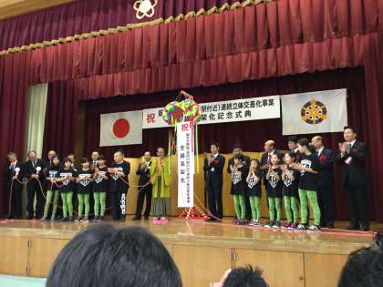 3月5日午前8時30分より,川岡小学校体育館を会場として,京都市・阪急電鉄主催の「阪急京都線(洛西口駅付近)連続立体交差化事業全線高架化に伴う記念式典」が行われました。お祝いの演舞には,本校リズムクラブの児童が参加しました。写真は最後の,くす玉が割れた場です。地域の皆様,おめでとうございます。