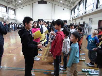 次は,「今までありがとう。」の気持ちをこめて,たてわり班で作ったプレゼントをわたします。