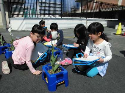 2年生のみんなが大事に育てたチューリップが、こんなにきれいな花を咲かせました。よく見て、観察してね。