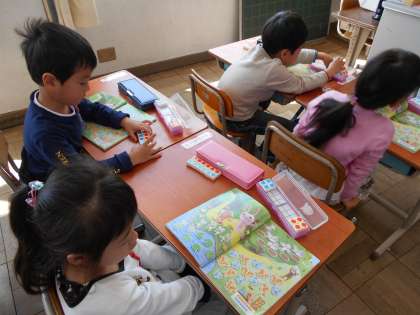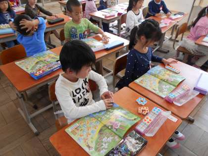 今日は数図ブロックを使って学習しました。「かえると葉っぱはどちらが多いかな。」と,みんな一生懸命考えています。おや?だれか頭をかかえていますね。