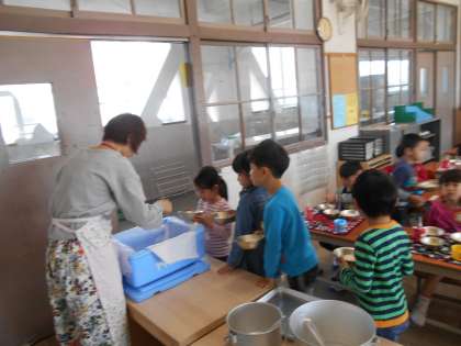 給食が始まって二日目です。みんなわくわくしながら給食の時間を待っていました。二時間目が終わったとたん,「先生,おなかすいた!」という声が聞こえてきました。待ちに待った給食は,おかわりにこんなにたくさんの行列ができました。今日もぺろり!たくさん食べましたね。
