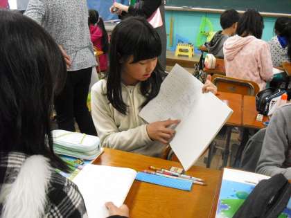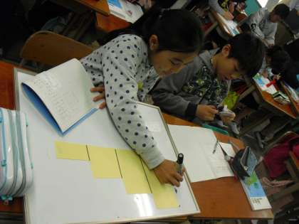 今日の算数は「わくわく算数学習」です。階段型の図形の面積の出し方を、みんなで考えました。