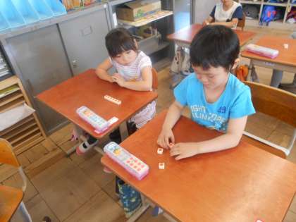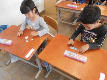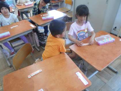 今日は数図ブロックを使って,「6」は「いくつといくつ」あわせるとできるか考えました。「1と5」「3と3」など,たくさん見つけることができました。見つけた自分の考えは,おとなりの人と交流しました。