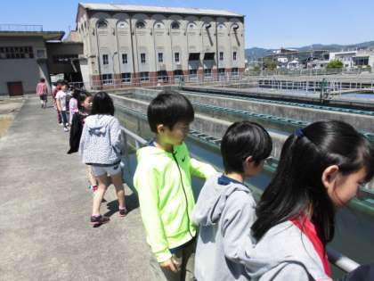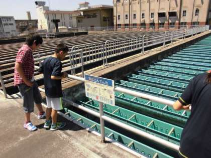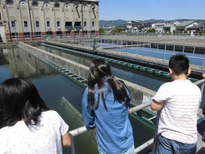 次に「沈殿池」を見学しました。薬品をまぜることで,目に見えないくらい小さなごみやよごれもかたまりになって,沈んでいきます。進んでいくにつれて水が透明になっていくのがわかりました。